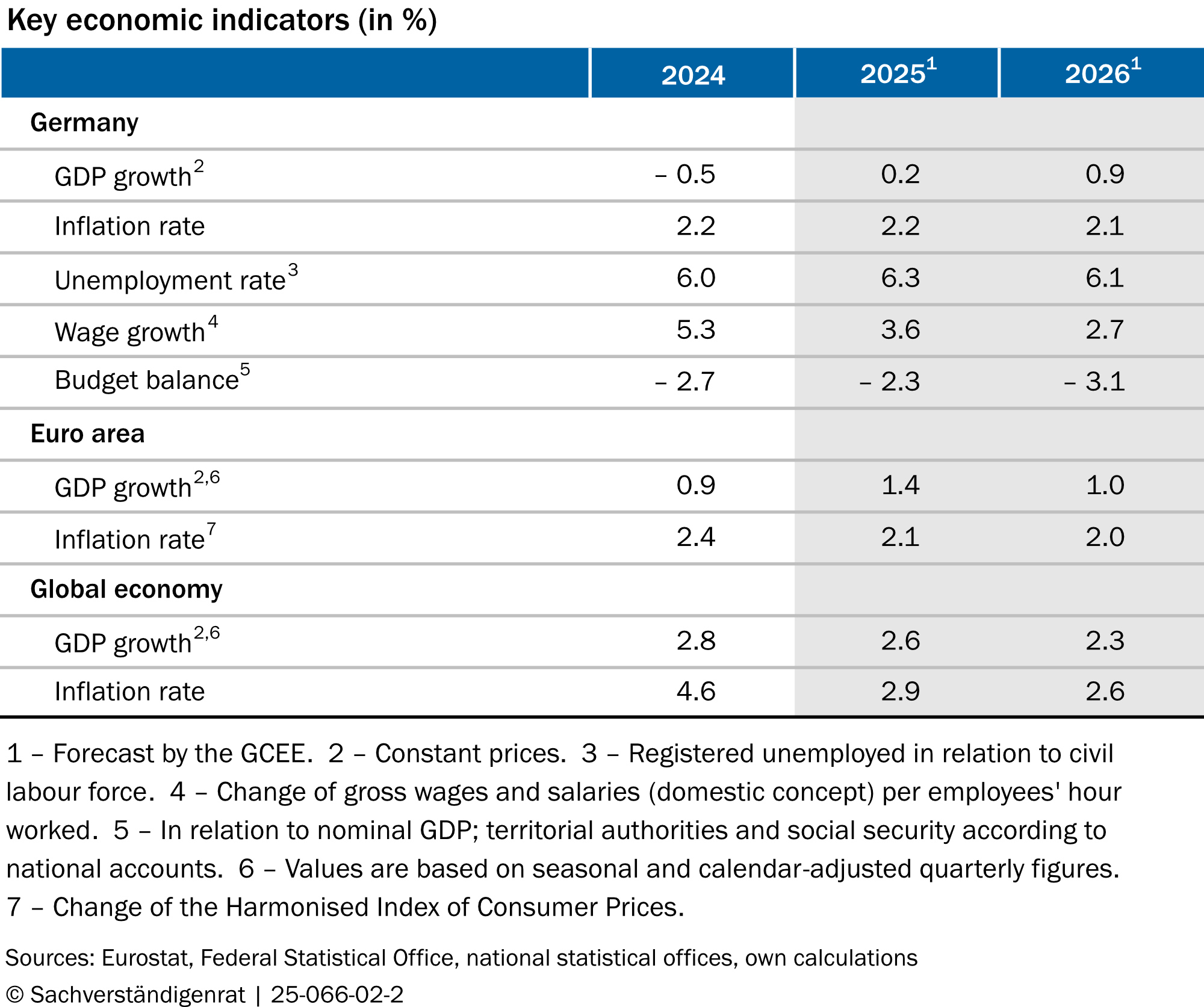 The German economy remains weak. While it is likely to grow in 2025 for the first time since 2022, growth will be minimal. The GCEE expects price-adjusted GDP growth of 0.2 per cent compared to the previous year. Weak private investment activity and a weak export economy are weighing on overall economic growth. The GCEE expects GDP to grow by 0.9 per cent in 2026. This is likely to be driven by increased government spending and the high number of working days due to calendar variations.