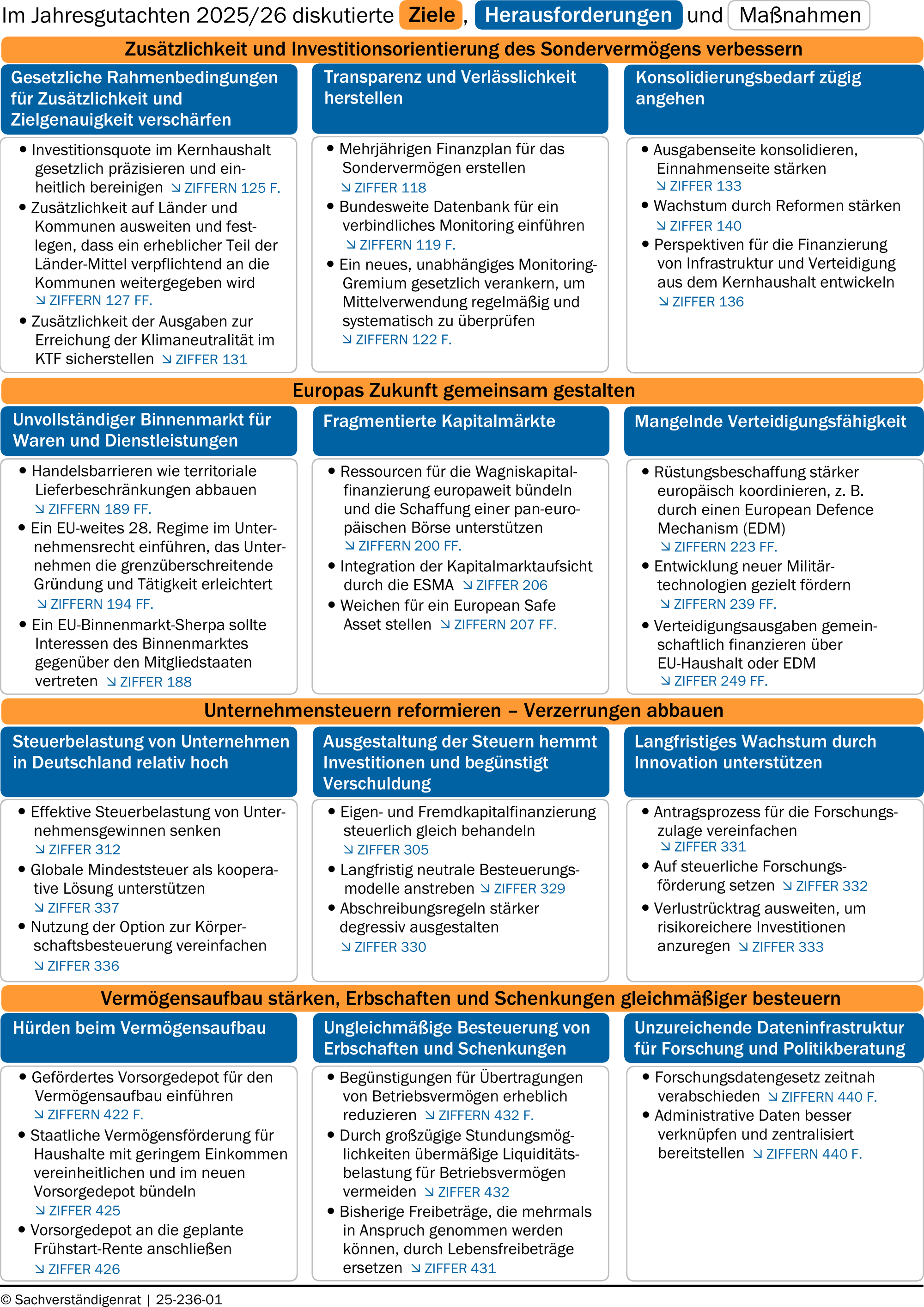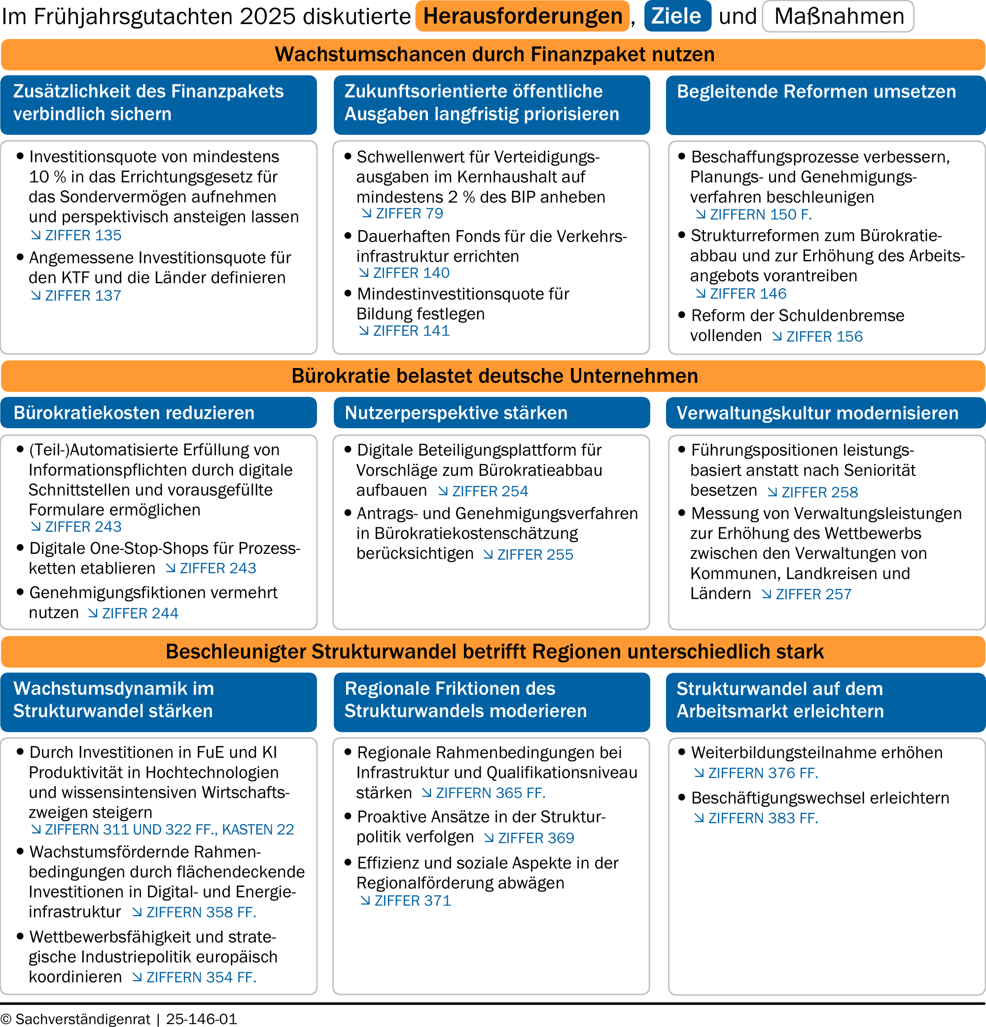 (2) Im Frühjahrsgutachten 2025 hat der Sachverständigenrat Wirtschaft eine erste Einschätzung des Finanzpakets vorgelegt. ZIFFERN 488 FF. Im Mittelpunkt standen dabei Fragen nach seiner zweckdienlichen Ausgestaltung sowie nach dessen gesamtwirtschaftlichen Wirkungen. Darüber hinaus hat der Sachverständigenrat im Frühjahr 2025 erörtert, wie durch einen konsequenten Abbau überflüssiger Bürokratie Kosten für die Unternehmen reduziert und Wachstumshemmnisse beseitigt werden können. ZIFFERN 588 ff. Schließlich wurde diskutiert, wie Deutschland die regional unterschiedlichen Auswirkungen des Strukturwandels bewältigen kann. ZIFFERN 693 FF.